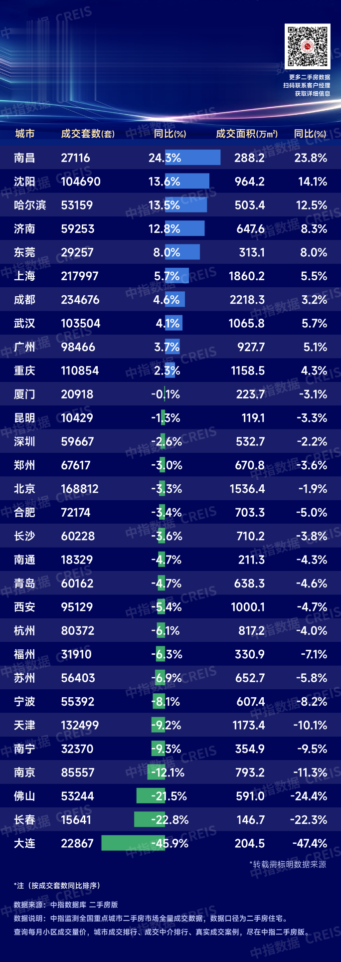 各城市来看,2025年,北京二手住宅成交17.4万套,同比微降0.8%,年底二手房成交集中释放,叠加放松限购政策带动,12月市场迎来“翘尾”收官,成交17200套,创下全年第二高成交量。上海二手住宅成交22.2万套,为2022年以来最高成交量,同比增长4%,12月二手住宅成交19935套。