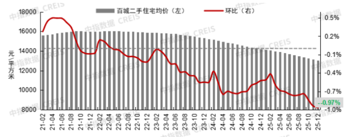 根据中国房地产指数系统百城价格指数,2025年12月,百城二手住宅均价环比下跌0.97%,同比下跌8.36%;十大城市二手住宅均价环比下跌1.25%,同比下跌7.32%。